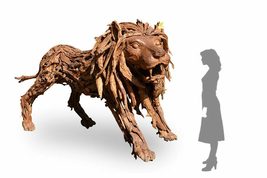 Διακοσμητικό ξυλόγλυπτό λιοντάρι από μασίφ ξύλινα μέρη σε φυσικές διαστάσεις με ακανόνιστες λεπτομέριες για πιο ιδιαίτερη έκφραση στον χώρο.