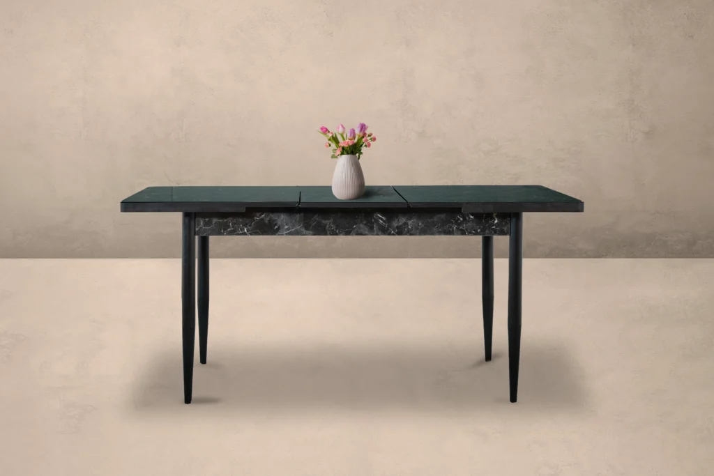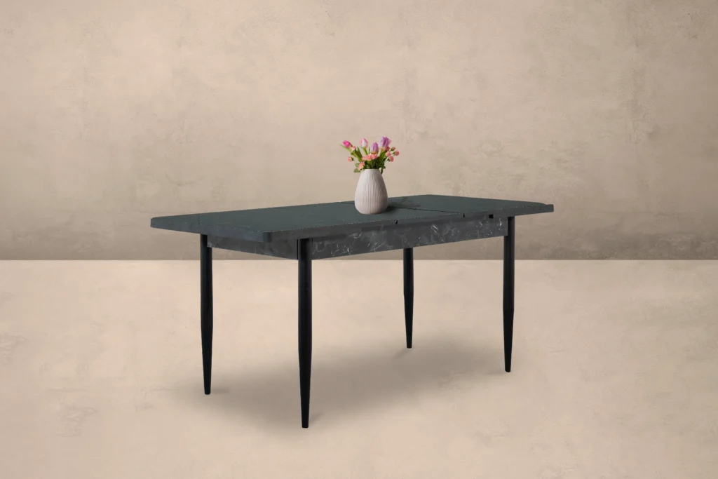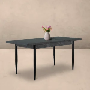 Το επεκτεινόμενο τραπέζι Ramina συνδυάζει την πρακτικότητα με τη σύγχρονη αισθητική. Η επιφάνεια με υφή μαρμάρου σε σκούρο γκρι χρώμα προσδίδει κομψότητα, ενώ τα λεπτά, μεταλλικά πόδια σε μαύρη απόχρωση ενισχύουν τη μοντέρνα γραμμή του σχεδιασμού. Χάρη στον μηχανισμό επέκτασης, προσφέρει επιπλέον χώρο όταν χρειάζεται, καθιστώντας το ιδανική επιλογή για καθημερινή χρήση αλλά και για φιλοξενία επισκεπτών.