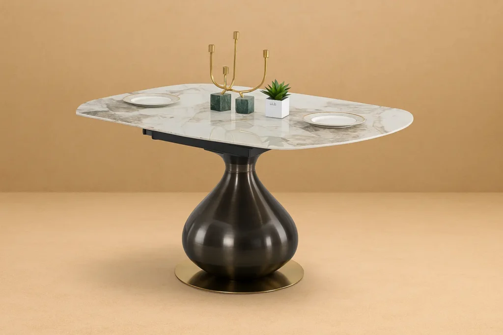 Το τραπέζι δείπνου Aladino εντυπωσιάζει με τον σύγχρονο σχεδιασμό και τη λειτουργική ευελιξία του. Η κεραμική επιφάνειά του προσφέρει υψηλή αντοχή στη θερμότητα, στους λεκέδες και στις γρατζουνιές, διατηρώντας παράλληλα μια κομψή, πέτρινη υφή που αναβαθμίζει αισθητικά τον χώρο.