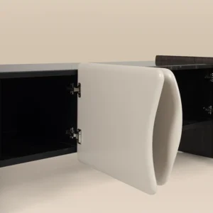 Οι πόρτες του επίπλου είναι μια αληθινή έκφραση της τέχνης και της λεπτομέρειας. Με μια ανοιχτή μπεζ απόχρωση που αγγίζει την τελειότητα, ο σχεδιασμός τους είναι εντυπωσιακός, με καμπύλες που ακολουθούν μια αρμονική ροή και λεπτομέρειες που δίνουν έμφαση σε κάθε γωνιά και γραμμή.