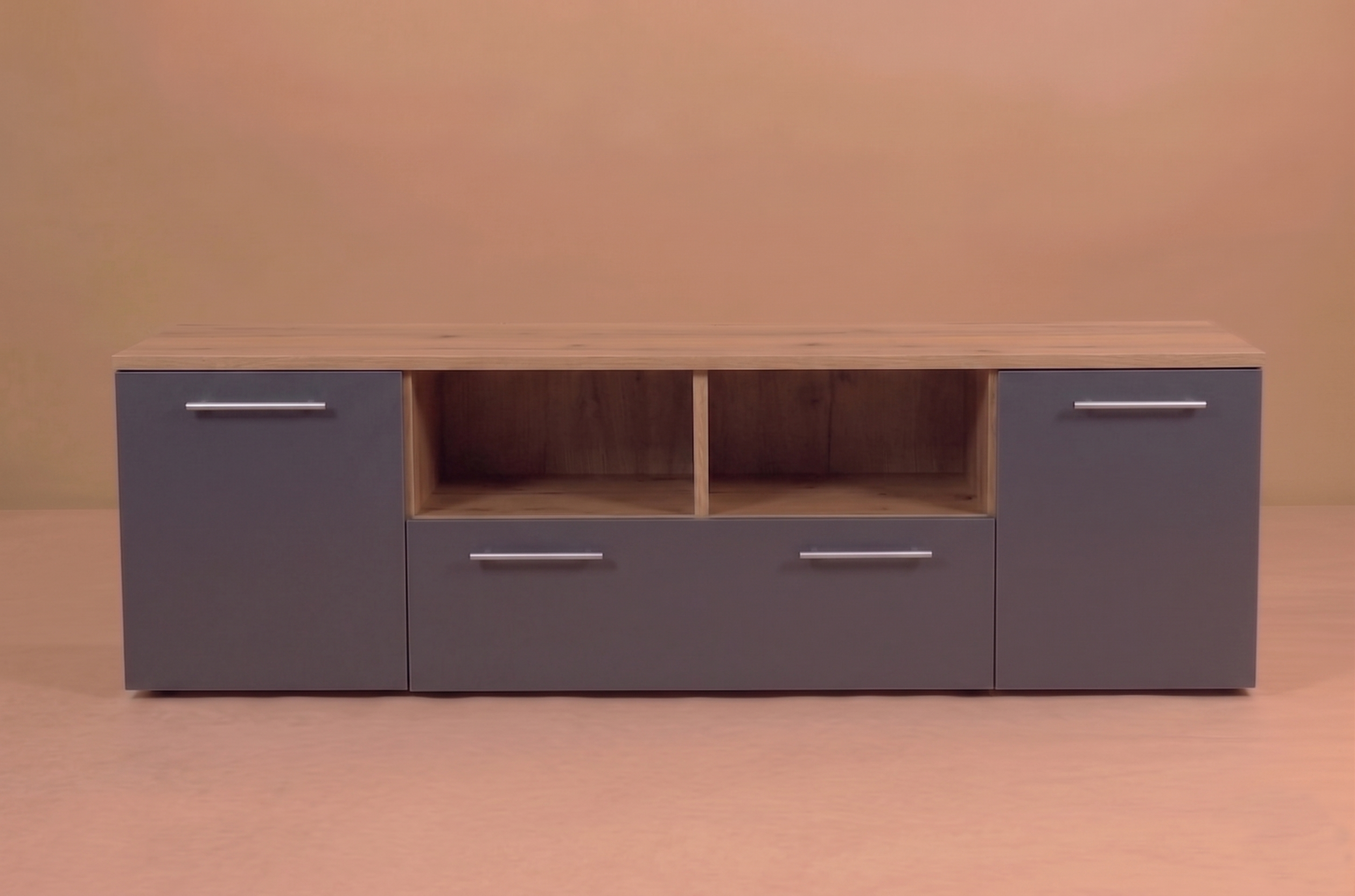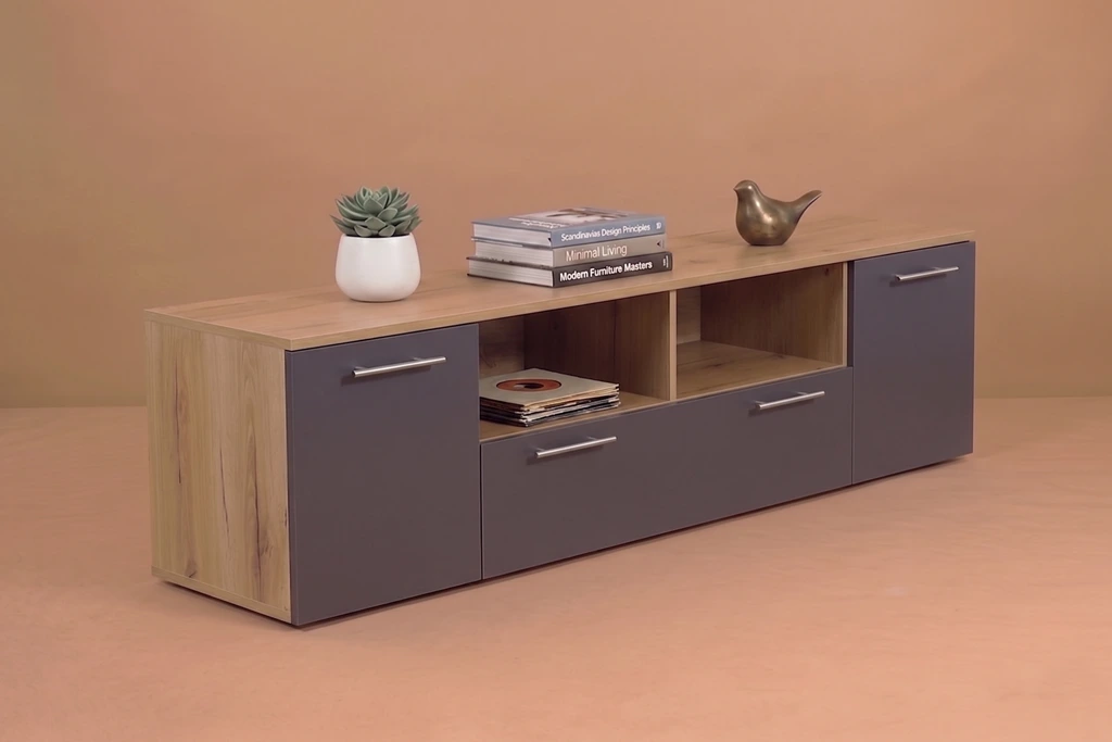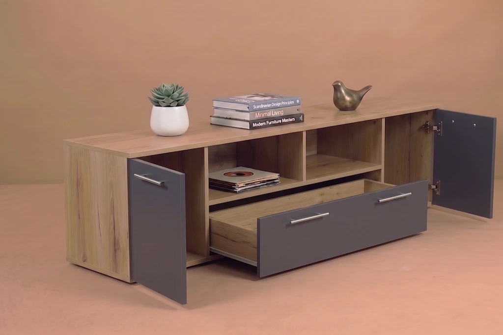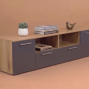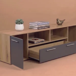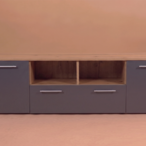 Το έπιπλο TV με σταχτί επιφάνεια και γκρί όψη προσφέρει μια μοντέρνα και κομψή λύση για τον χώρο ψυχαγωγίας σας. Με τα ντουλάπια του που διαθέτουν πολλούς αποθηκευτικούς χώρους, μπορείτε να οργανώσετε και να αποθηκεύσετε με άνεση όλα τα απαραίτητα αξεσουάρ και συσκευές για την ψυχαγωγία σας.   Οι τρεις διαθέσιμες διαστάσεις του έπιπλου (120 cm, 140 cm και 180 cm) σας επιτρέπουν να επιλέξετε ανάλογα με τον χώρο σας και τις ανάγκες σας. Είτε πρόκειται για ένα μικρό διαμέρισμα είτε για ένα ευρύχωρο σαλόνι, θα βρείτε το κατάλληλο μέγεθος που ταιριάζει άψογα.