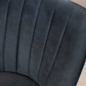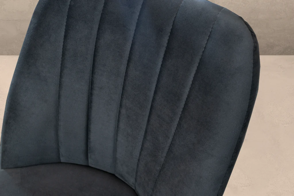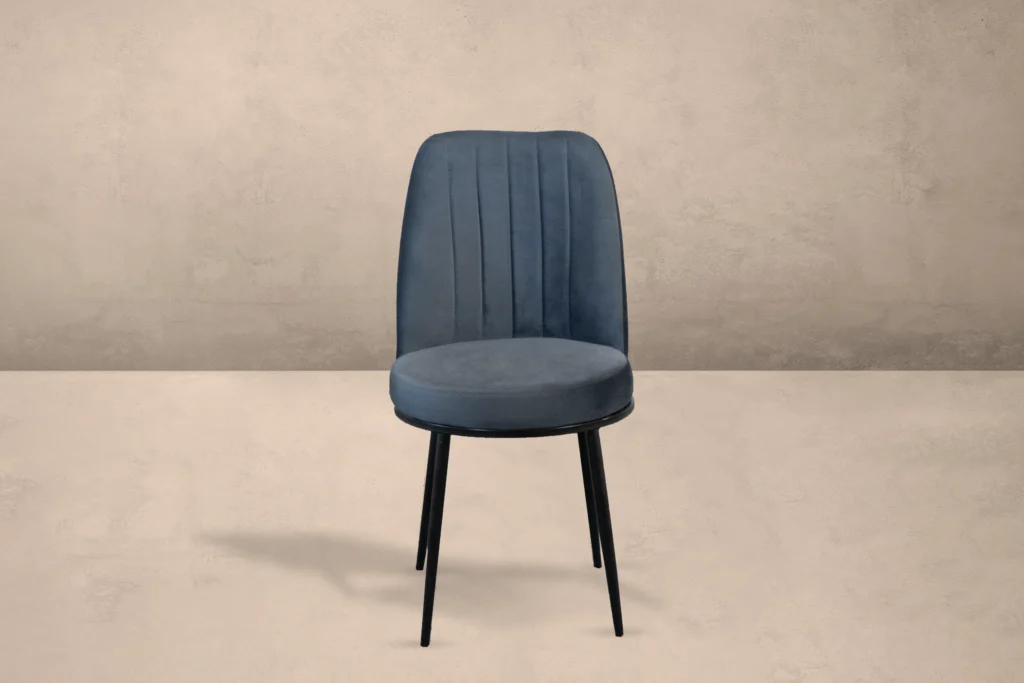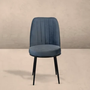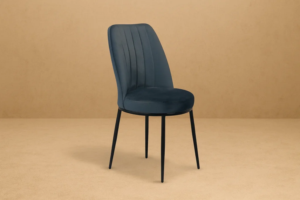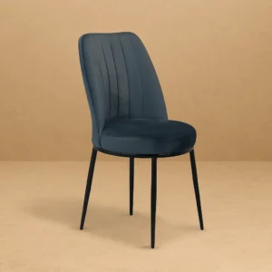 Η καρέκλα Rinetta συνδυάζει κομψότητα και μοντέρνα αισθητική. Με επένδυση από βελούδινο ύφασμα σε βαθύ μπλε χρώμα και κάθετες διακοσμητικές ραφές στην πλάτη, προσφέρει εκλεπτυσμένο στυλ σε κάθε τραπεζαρία. Τα μεταλλικά μαύρα πόδια της προσδίδουν σταθερότητα και σύγχρονο χαρακτήρα, καθιστώντας την ιδανική επιλογή για χώρους με μοντέρνο ή minimal design.