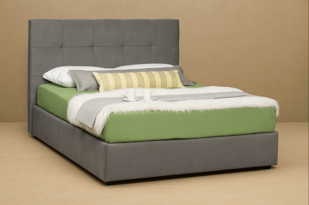 Μοντέρνο κρεβάτι με επένδυση από microfibra easy clean βελούδινης υφής σε γκρι απόχρωση. Διαθέτει ιδιαίτερη σχεδίαση, ξύλινα ελάσματα, μεταλλικό και ορθοπεδικό σωμιέ που πετυχαίνει την μέγιστη απόδοση του στρώματος και με την επιλογή αποθηκευτικό χώρο. Μία κομψή και συνάμα πρακτική επιλογή που θα στολίσει το υπνοδωμάτιο σας.