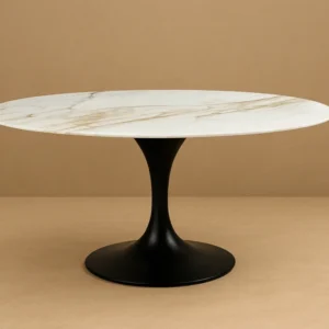 Η βάση του τραπεζιού είναι καμπυλωτή και σε μαύρο χρώμα δημιουργώντας μια αρμονική αντίθεση μεταξύ του μαύρου και του λευκού, προσδίδοντας στο τραπέζι μια μοντέρνα και εκλεπτυσμένη εμφάνιση.